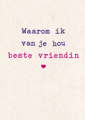 Waarom ik van je hou beste vriendin is een lief en vrolijk invulboek met diepgaande, grappige en emotionele vragen en opdrachten, allemaal met maar één doel: de bijzondere vriendschap van jou en je beste vriendin in woorden te vatten. Helemaal ingevuld is het het meest persoonlijke cadeau dat je kunt geven, en een bewijs van echte vriendschap.