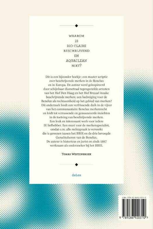 Dit is een bijzonder boekje: een master scriptie over beschrijvende merken in de Benelux en in Europa. De auteur werd geïnspireerd door schijnbaar diametraal tegengestelde arresten van het Hof Den Haag en het Hof Brussel inzake beschrijvende merken; een bedreiging voor de Benelux als rechtseenheid op het gebied van merken? Dit onderzoek biedt een verfrissende duik in de vijver van het communautaire Benelux merkenrecht en leidt tot verrassende en genuanceerde inzichten in de toetsing van beschrijvende merken. Een leuk en interessant werk voor iedere IE liefhebber. Een must voor de merkenspecialist, omdat o.m. alle rechtspraak is verwerkt die is gewezen tussen het BBIE en de drie bevoegde Gerechtshoven van de Benelux. De auteur is historicus en jurist en sinds 1997 werkzaam als onderzoeker bij het BBIE.