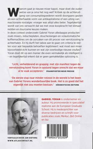 Waarom gaat je nieuwe mixer kapot, maar doet die ouderwetse van je oma het nog wel? Kritiek op de achteruitgang van consumptiegoederen wordt doorgaans gezien als een achterhaalde vorm van antikapitalisme of een uiting van reactionaire nostalgie: vroeger was altijd alles beter. Tegelijkertijd wordt van ons verwacht dat we met onze koopkracht het klimaat redden en duurzame keuzes maken. In deze context onderzoekt Gabriel Yoran alledaagse producten zoals mixers, inductieplaten, doucheslangen en volautomatische koffiemachines om de oorzaken van dit proces van verrotzooiing te achterhalen. En hij durft het taboe aan te gaan om criteria te stellen voor wat bepaalde behoeften legitimeert: wat moet een mixer bijvoorbeeld écht kunnen en wat zijn overbodige nieuwe snufjes? Yoran doet dit op een manier die even vermakelijk als intelligent is – en tegelijkertijd erkent dat er geen gemakkelijke oplossing is.
