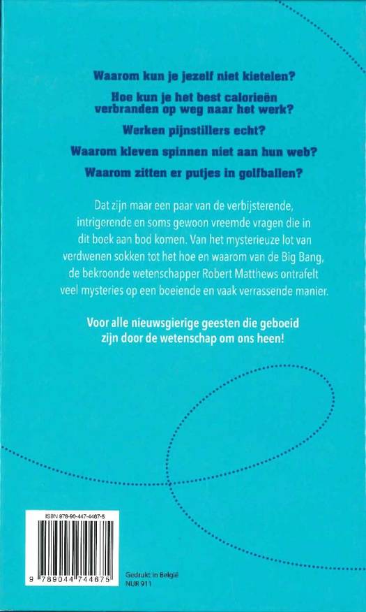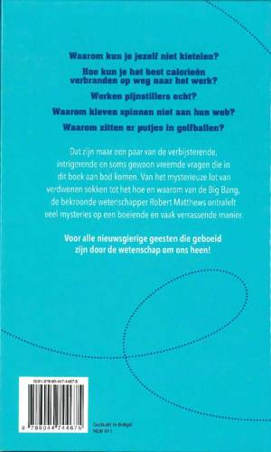 Waarom kun je jezelf niet kietelen? Hoe kun je het best calorieën verbranden op weg naar het werk? Werken pijnstillers echt? Waarom kleven spinnen niet aan hun web? Waarom zitten er putjes in golfballen? Dat zijn maar een paar van de verbijsterende, intrigerende en soms gewoon vreemde vragen die in dit boek aan bod komen. Van het mysterieuze lot van verdwenen sokken tot het hoe en waarom van de Big Bang, de bekroonde wetenschapper Robert Matthews ontrafelt veel mysteries op een boeiende en vaak verrassende manier. Voor alle nieuwsgierige geesten die geboeid zijn door de wetenschap om ons heen!