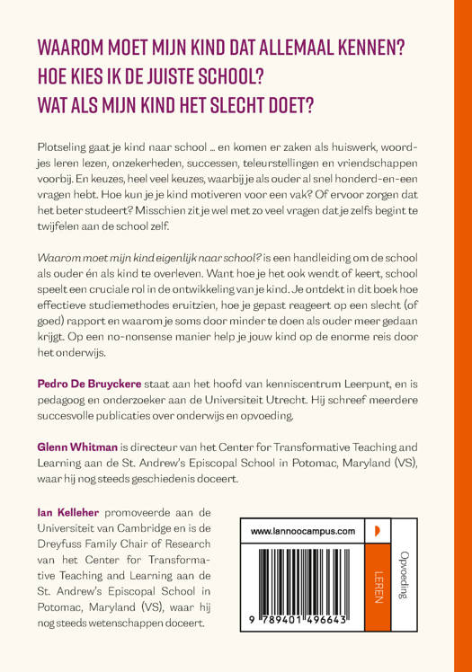 Waarom moet mijn kind eigenlijk naar school? is een handleiding om de school als ouder én als kind te overleven. Want hoe je het ook wendt of keert, school speelt een cruciale rol in de ontwikkeling van je kind. Je ontdekt in dit boek hoe effectieve studiemethodes eruitzien, hoe je gepast reageert op een slecht (of goed) rapport en waarom je soms door minder te doen als ouder meer gedaan krijgt. Op een no-nonsense manier help je jouw kind op de enorme reis door het onderwijs.