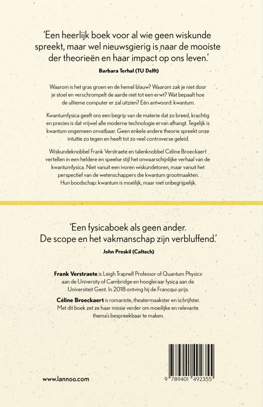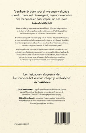 Waarom is gras groen en de hemel blauw? Waarom zak je niet door je stoel en verschrompelt de aarde niet tot een erwt? Wat bepaalt hoe de ultieme computer er zal uitzien? Eén antwoord: kwantum Kwantumfysica geeft ons een begrip van de materie dat zo breed, krachtig en precies is dat vrijwel alle moderne technologie ervan afhangt. Tegelijk is kwantum ongemeen onvatbaar. Geen enkele andere theorie spreekt onze intuïtie zo tegen en heeft tot zoveel controverse geleid. Wiskundeknobbel Frank Verstraete en talenknobbel Céline Broeckaert vertellen in een heldere en speelse stijl het onwaarschijnlijke verhaal van de kwantumfysica. Niet vanuit een ivoren wiskundetoren, maar vanuit het perspectief van de wetenschappers die kwantum grootmaakten. Hun boodschap: kwantum is moeilijk, maar niet onbegrijpelijk.