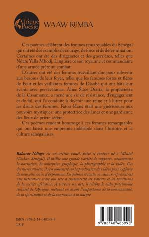 Ces poèmes célèbrent des femmes remarquables du Sénégal qui ont été des exemples de courage, de force et de détermination. Certaines ont été des dirigeantes et des guerrières, telles que Ndaté Yalla Mbodj, Linguère de son royaume et commandante d'une armée prête au combat. D'autres ont été des femmes travaillant dur pour subvenir aux besoins de leur foyer, telles que les femmes fortes et fières de Pout et les vaillantes femmes de Diaobé qui ont bâti leur avenir avec persévérance. Aline Sitoé Diatta, la prophétesse de la Casamance, a mené une vie de résistance, d'engagement et de foi, qui l'a conduite à devenir une reine et à lutter pour les droits des femmes. Fatou Mané était une guérisseuse aux pouvoirs mystiques, une protectrice des âmes et une gardienne des lieux de prière sérère. Ces poèmes rendent hommage à ces femmes remarquables qui ont laissé une empreinte indélébile dans l'histoire et la culture sénégalaises.