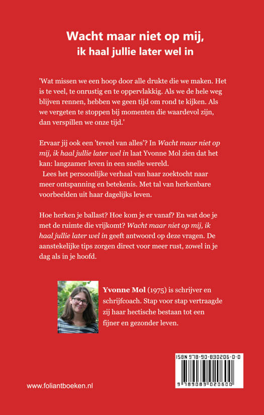 Ervaar jij ook een teveel van alles? In 'Wacht maar niet op mij, ik haal jullie later wel in' laat Yvonne Mol zien dat het kan: langzamer leven in een snelle wereld. Lees het persoonlijke verhaal van haar zoektocht naar meer ontspanning en betekenis. Met tal van herkenbare voorbeelden uit haar dagelijks leven.