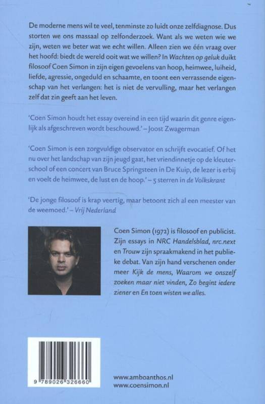 De moderne mens verlangt te veel, tenminste zo luidt zijn zelfdiagnose. Dus storten we ons massaal op zelfontplooiing. Want als we weten wie we zijn, weten we beter wat we echt willen. Alleen zien we één vraag over het hoofd: biedt de wereld ooit wat we willen? Helaas, de wereld is geen etalage vol met waren die onze verlangens kunnen bevredigen. En onze verlangens zijn niet te bevredigen als een lege maag. In 'Wachten op geluk' duikt filosoof Coen Simon in zijn persoonlijke gevoelens van hoop, heimwee, jaloezie, troost, geduld en schaamte en toont de verrassende wijsheid van het verlangen: het is niet de vervulling, maar het is het verlangen zelf dat zin geeft aan het leven.
