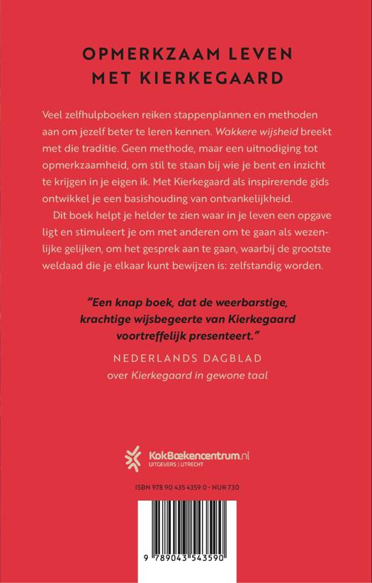 In 'Wakkere wijsheid' zet Kierkegaardkenner Geert Jan Blanken het denken van de Deense filosoof Søren Kierkegaard om in het meest onpraktische zelfhulpboek. Tal van zelfhulpboeken bieden stappenplannen en methoden om jezelf beter te leren kennen. Dit boek breekt met die traditie. Het biedt geen methode, maar leert je opmerkzaam te worden. Op wie je bent. Om inzicht te verkrijgen in je eigen ik. Met Kierkegaard als gids. Het resultaat is een basishouding van ontvankelijkheid. Het boek helpt je de gebieden in je leven scherp te krijgen waar een opgave ligt en het stimuleert je om met anderen om te gaan als wezenlijke gelijken, om het gesprek aan te gaan, waarbij de grootste weldaad die je elkaar kunt bewijzen is: zelfstandig worden.