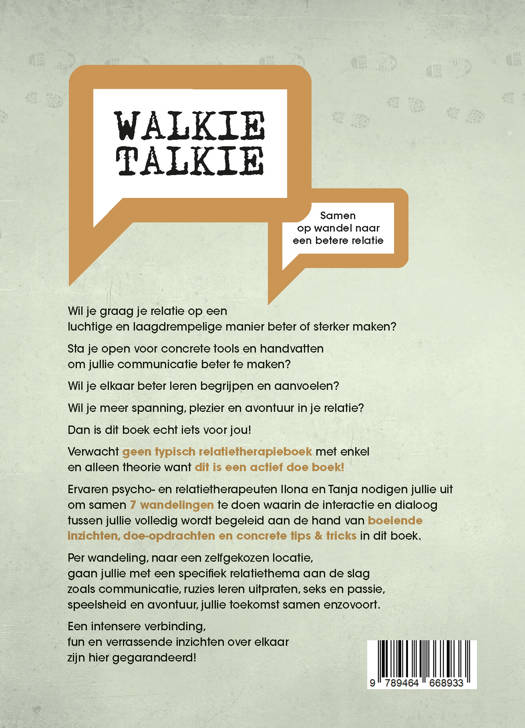 Ervaren psycho- en relatietherapeuten Ilona en Tanja nodigen jullie uit om samen 7 wandelingen te doen waarin de interactie en dialoog tussen jullie volledig wordt begeleid aan de hand van boeiende inzichten, doe-opdrachten en concrete tips & tricks in dit boek.