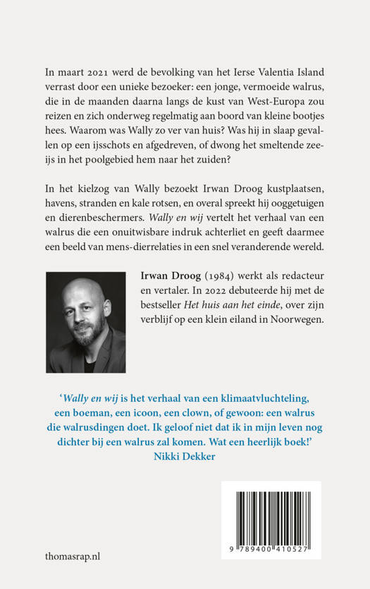 In maart 2021 werd de bevolking van het Ierse Valentia Island verrast door een unieke bezoeker: een jonge, vermoeide walrus, die in de maanden daarna langs de kust van West-Europa zou reizen en zich onderweg regelmatig aan boord van kleine bootjes hees. Waarom was deze walrus zo ver van huis? Was hij in slaap gevallen op een ijsschots en afgedreven, of dwong het smeltende zee-ijs in het poolgebied hem naar het zuiden? Het lijkt erop dat we ons leefgebied meer en meer zullen gaan delen met diersoorten die we vroeger alleen konden bewonderen in dierentuinen. Hoe gaan we daarmee om? Irwan Droog trad in de voetsporen van Wally, en ging op zoek naar antwoorden. Wally en wij vertelt het verhaal van een walrus die een onuitwisbare indruk achterliet, tegen de achtergrond van mens-dierrelaties in een snel veranderende wereld.
