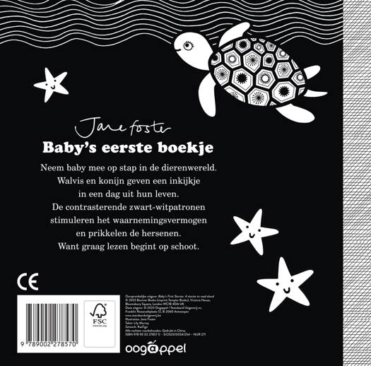 Neem baby mee op stap in de dierenwereld. Walvis en konijn geven een inkijkje in een dag uit hun leven. De contrasterende zwart-witpatronen stimuleren het waarnemingsvermogen en prikkelen de hersenen. Want graag lezen begint op schoot.