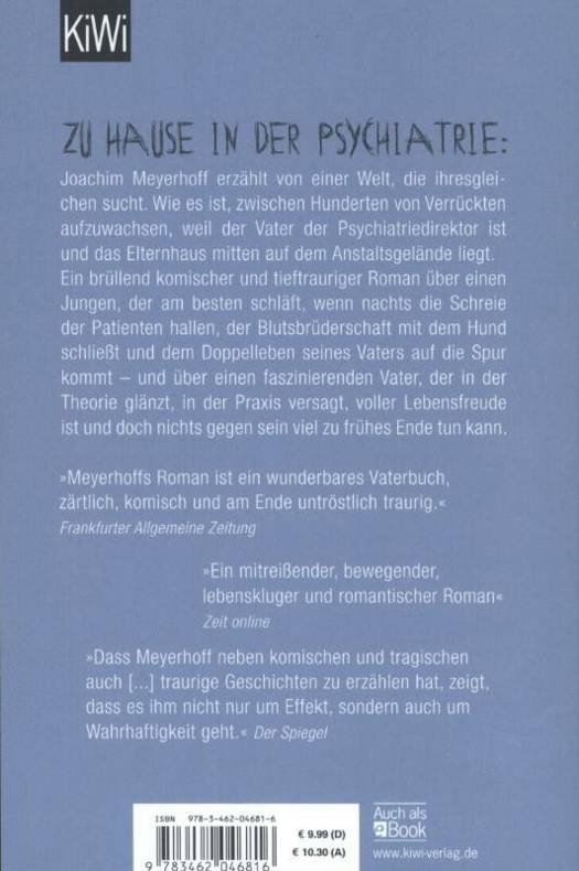 Joachim Meyerhoff erzählt liebevoll und komisch von einer außergewöhnlichen Familie an einem außergewöhnlichen Ort, die aneinander hängt, aber auseinandergerissen wird. Und von einem Vater, der in der Theorie glänzt, in der Praxis aber stets versagt. Wer schafft es sonst, den Vorsatz zum 40. Geburtstag, sich mehr zu bewegen, gleich mit einer Bänderdehnung zu bezahlen und die teuren Laufschuhe nie wieder anzuziehen? Oder bei Flaute mit dem Segelboot in Seenot zu geraten und vorher noch den Sohn über Bord zu werfen?