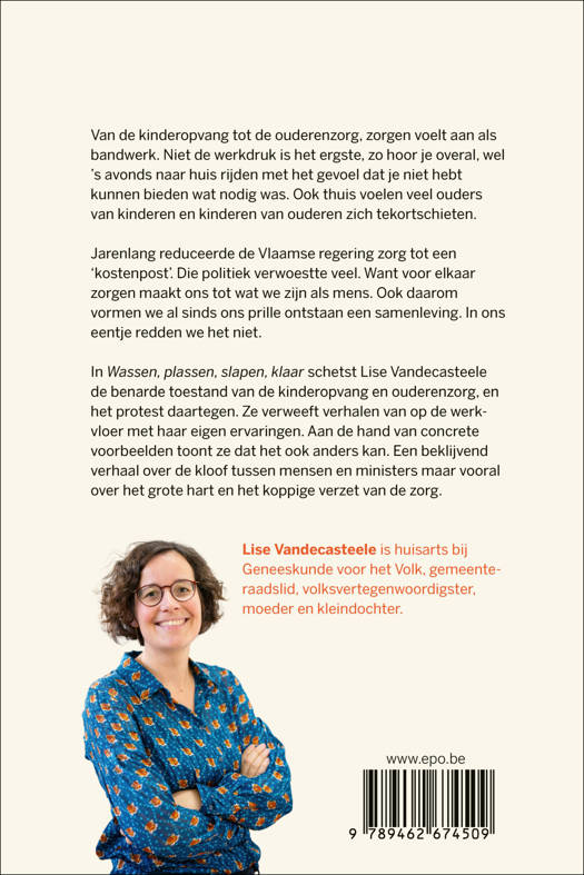 In Wassen, plassen, slapen, klaar schetst Lise Vandecasteele de benarde toestand van de kinderopvang en ouderenzorg, en het protest daartegen. Ze verweeft verhalen van op de werkvloer met haar eigen ervaringen als activiste, huisarts en volksvertegenwoordigster, moeder en kleindochter. Aan de hand van concrete voorbeelden toont ze dat het ook anders kan. Een beklijvend verhaal over de kloof tussen mensen en ministers maar vooral over het grote hart en het koppige verzet van de zorg.