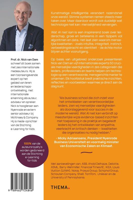 Wat AI niet kan is een inspirerend boek over leiderschap, groei en betekenis in een tijdperk vol algoritmen en data. Het laat zien waarom menselijke kwaliteiten – zoals intuïtie, integriteit, instinct, verbeeldingskracht en identiteit – de échte motor blijven achter vooruitgang.
