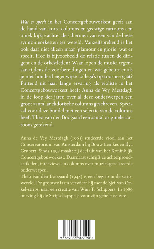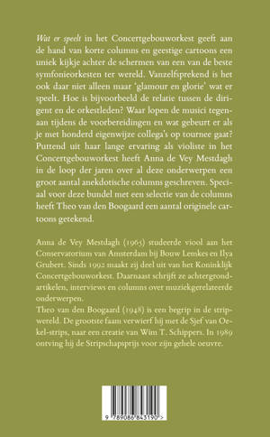 Wat er speelt in het Concertgebouworkest geeft aan de hand van korte columns en geestige cartoons een uniek kijkje achter de schermen van een van de beste symfonieorkesten ter wereld. Vanzelfsprekend is het ook daar niet alleen maar ‘glamour en glorie’ wat er speelt. Hoe is bijvoorbeeld de relatie tussen de dirigent en de orkestleden? Waar lopen de musici tegenaan tijdens de voorbereidingen en wat gebeurt er als je met honderd eigenwijze collega’s op tournee gaat? Puttend uit haar lange ervaring als violiste in het Concertgebouworkest heeft Anna de Vey Mestdagh in de loop der jaren over al deze onderwerpen een groot aantal anekdotische columns geschreven. Speciaal voor deze bundel met een selectie van de columns heeft Theo van den Boogaard een aantal originele cartoons getekend.