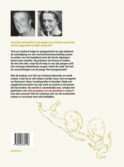 Wat de boeken van Ted van Lieshout bijzonder en uniek maakt, is dat hij ze niet alleen schrijft, maar ook vormgeeft en illustreert. Deze ‘autobiografie-in-beelden’ biedt een uitgebreid overzicht van zijn werk en inzicht in de keuzes die hij maakte. Hij vertelt er aanstekelijk over, omlijst met gedichten. Wat heb jij gedaan om mij gelukkig te maken? laat zien waarom Ted van Lieshout een van de markantste makers is van kunst voor alle leeftijden.