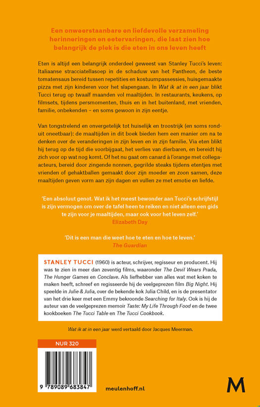 Eten is altijd een belangrijk onderdeel geweest van Stanley Tucci’s leven: Italiaanse stracciatellasoep in de schaduw van het Pantheon, de beste tomatensaus bereid tussen repetities en kostuumpassessies, huisgemaakte pizza met zijn kinderen voor het slapengaan… In Wat ik at in een jaar blikt Tucci terug op twaalf maanden vol maaltijden. In restaurants, keukens, op filmsets, tijdens persmomenten, thuis en in het buitenland, met vrienden, familie, onbekenden – en soms gewoon in zijn eentje.