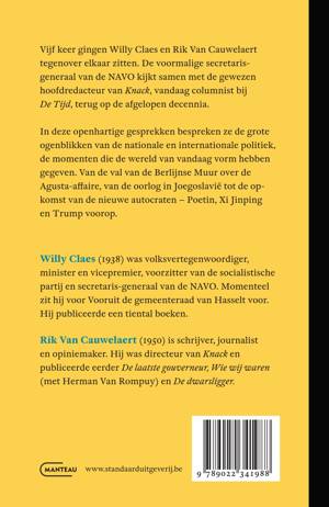 Vijf keer gingen Willy Claes en Rik Van Cauwelaert tegenover elkaar zitten. De voormalige secretarisgeneraal van de NAVO kijkt samen met de gewezen hoofdredacteur van Knack, vandaag columnist bij De Tijd, terug op de afgelopen decennia. In deze openhartige gesprekken bespreken ze de grote ogenblikken van de nationale en internationale politiek, de momenten die de wereld van vandaag vorm hebben gegeven. Van de val van de Berlijnse Muur over de Agusta-affaire, van de oorlog in Joegoslavië tot de opkomst van de nieuwe autocraten – Poetin, Xi Jinping en Trump voorop.