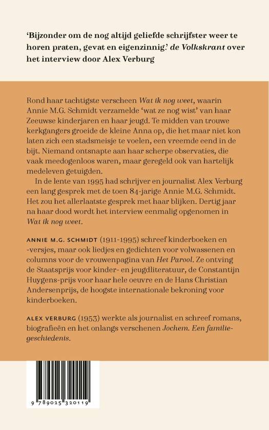 Rond haar tachtigste verscheen Wat ik nog weet, waarin Annie M.G. Schmidt verzamelde ‘wat ze nog wist’ van haar Zeeuwse kinderjaren en haar jeugd. Te midden van trouwe kerkgangers groeide de kleine Anna op, die het maar niet kon laten zich een stadsmeisje te voelen, een vreemde eend in de bijt. Niemand ontsnapte aan haar scherpe observaties, die vaak meedogenloos waren, maar geregeld ook van hartelijk medeleven getuigden.