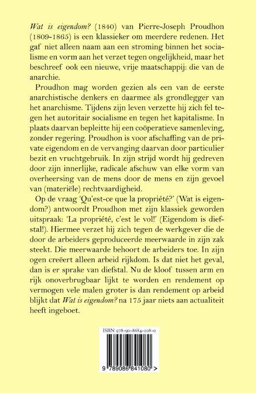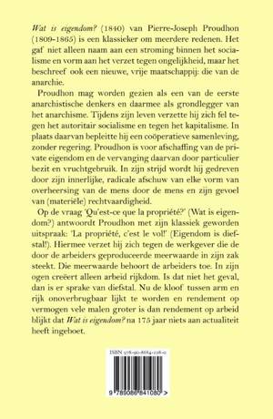 Wat is eigendom? (1840) van Pierre-Joseph Proudhon (1809-1865) is een klassieker om meerdere redenen. Het gaf niet alleen naam aan een stroming binnen het socialisme en vorm aan het verzet tegen ongelijkheid, maar het beschreef ook een nieuwe, vrije maatschappij: die van de anarchie. Proudhon mag worden gezien als een van de eerste anarchistische denkers en daarmee als grondlegger van het anarchisme. Tijdens zijn leven verzette hij zich fel tegen het autoritair socialisme en tegen het kapitalisme. In plaats daarvan bepleitte hij een coöperatieve samenleving, zonder regering. Proudhon is voor afschaffing van de private eigendom en de vervanging daarvan door particulier bezit en vruchtgebruik. In zijn strijd wordt hij gedreven door zijn innerlijke, radicale afschuw van elke vorm van overheersing van de mens door de mens en zijn gevoel van (materiële) rechtvaardigheid. Op de vraag 'Qu'est-ce que la propriété?' (Wat is eigendom?) antwoordt Proudhon met zijn klassiek geworden uitspraak: 'La propriété, c'est le vol!' (Eigendom is diefstal!). Hiermee verzet hij zich tegen de werkgever die de door de arbeiders geproduceerde meerwaarde in zijn zak steekt. Die meerwaarde behoort de arbeiders toe. In zijn ogen creëert alleen arbeid rijkdom. Is dat niet het geval, dan is er sprake van diefstal. Nu de kloof tussen arm en rijk onoverbrugbaar lijkt te worden en rendement op vermogen vele malen groter is dan rendement op arbeid blijkt dat Wat is eigendom? na 175 jaar niets aan actualiteit heeft ingeboet.