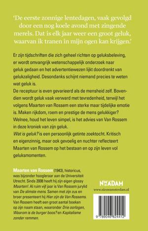 Wat is geluk? Er zijn tijdschriften die geheel gericht zijn op geluksbeleving, er wordt omvangrijk wetenschappelijk onderzoek gedaan naar de samenstellende delen van geluk en het advertentiewezen lijkt geheel gewijd aan geluksverwerving. Desondanks schijnt niemand precies te weten wat geluk is. De receptuur is even gevarieerd als de mensheid zelf. Bovendien wordt gelukservaring vaak verward met tevredenheid, terwijl het volgens Van Rossem een sterke, maar tijdelijke emotie is. De omstandigheden kunnen geluksgevoelens bevorderen. In een welvarend land, waar geweld en willekeur uitzonderlijk zijn, is meer gelegenheid voor het ervaren van geluk dan in een land als Oeganda. Wat is geluk? is een persoonlijk getinte zoektocht, met Van Rossems reflectie op het leven.