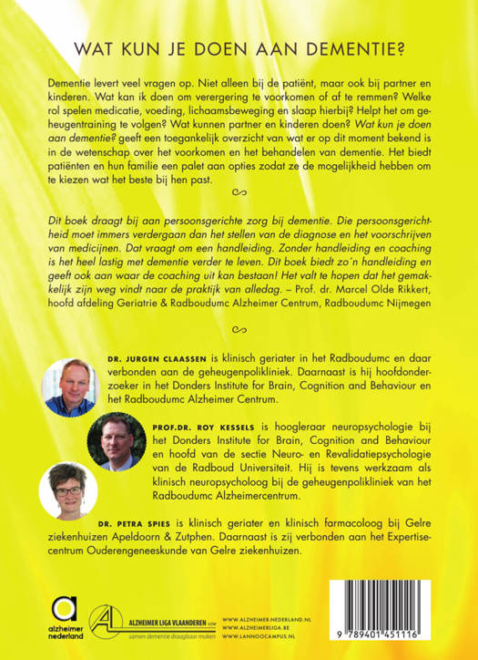 Dementie levert veel vragen op. Niet alleen bij de patiënt, maar ook bij partner en kinderen. Wat kan ik doen om verergering te voorkomen of af te remmen? Welke rol spelen medicatie, voeding, lichaamsbeweging en slaap hierbij? Helpt het om geheugentraining te volgen? Wat kunnen partner en kinderen doen?