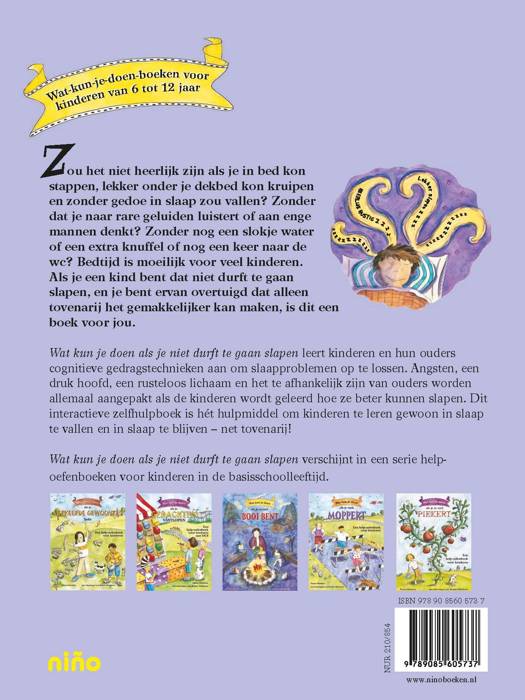 Zou het niet heerlijk zijn als je in bed kon stappen, lekker onder je dekbed kon kruipen en zonder gedoe in slaap zou vallen? Zonder dat je naar rare geluiden luistert of aan enge mannen denkt? Zonder nog een slokje water of een extra knuffel of nog een keer naar de wc? Bedtijd is moeilijk voor veel kinderen. Als je een kind bent dat niet durft te gaan slapen, en je bent ervan overtuigd dat alleen tovenarij het gemakkelijker kan maken, is dit een boek voor jou."Wat kun je doen als je niet durft te gaan slapen?" leert kinderen en hun ouders cognitieve gedragstechnieken aan om slaapproblemen op te lossen. Angsten, een druk hoofd, een rusteloos lichaam en het te afhankelijk zijn van ouders worden allemaal aangepakt als de kinderen wordt geleerd hoe ze beter kunnen slapen. Dit interactieve zelfhulpboek is hét hulpmiddel om kinderen te leren gewoon in slaap te vallen en in slaap te blijven ? net tovenarij!"Wat kun je doen als je niet durft te gaan slapen" verschijnt in een serie help-oefenboeken voor kinderen in de basisschoolleeftijd.