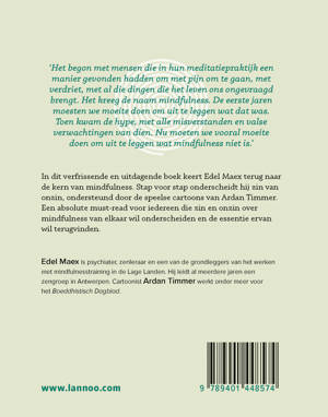 In dit verfrissende en uitdagende boek keert Edel Maex terug naar de kern van mindfulness. Stap voor stap onderscheidt hij zin van onzin, ondersteund door de speelse cartoons van Ardan Timmer. Een absolute must-read voor iedereen die zin en onzin over mindfulness van elkaar wil onderscheiden en de essentie ervan wil terugvinden.
