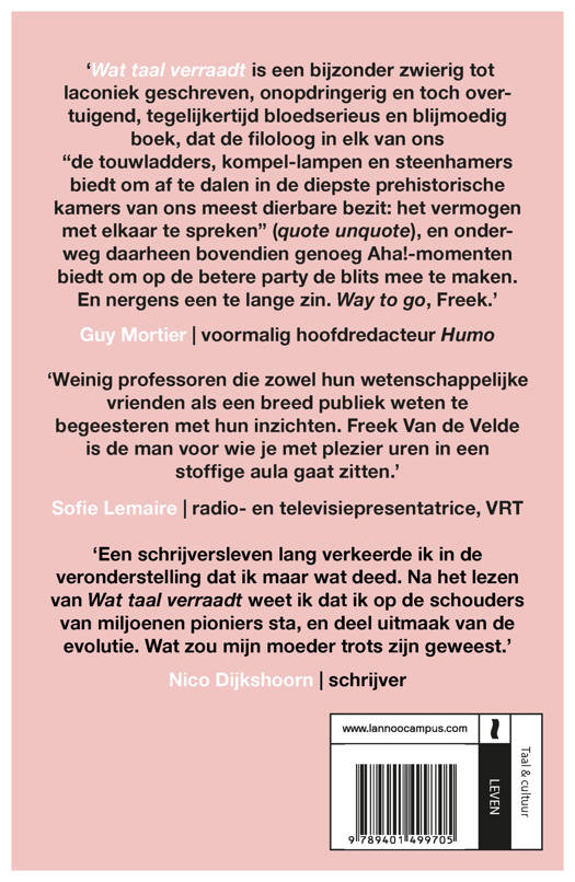 'Wat taal verraadt is een bijzonder zwierig tot laconiek geschreven, onopdringerig en toch overtuigend, tegelijkertijd bloedserieus en blijmoedig boek, dat de filoloog in elk van ons "de touwladders, kompel-lampen en steenhamers biedt om af te dalen in de diepste prehistorische kamers van ons meest dierbare bezit: het vermogen met elkaar te spreken" (quote unquote), en onderweg daarheen bovendien genoeg Aha!-momenten biedt om op de betere party de blits mee te maken. En nergens een te lange zin. Way to go, Freek.'