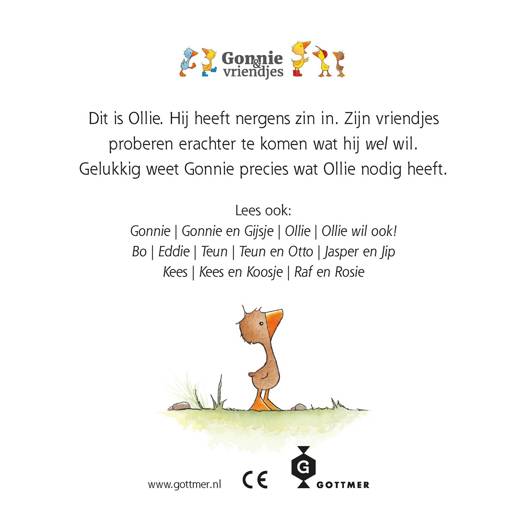 Het koppige, kleine gansje Ollie speelt de hoofdrol in het boekje 'Wat wil Ollie?', een nieuw verhaaltje over een van Gonnies beste vriendjes. Ollie voelt zich niet blij en heeft nergens zin in, maar gelukkig weet Gonnie wel wat de kleine Ollie nodig heeft: een dikke, warme knuffel. Het kartonnen boekje is mooi verpakt in een cadeaudoos met een superzachte pluchen knuffel van Ollie. Zo kan er tijdens het voorlezen lekker gespeeld worden. Ook leuk om als kraamcadeau te geven!