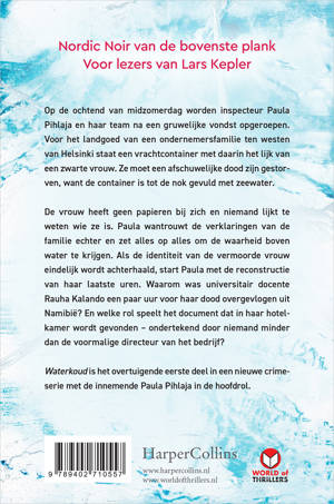 Op de ochtend van midzomerdag worden inspecteur Paula Pihlaja en haar team na een gruwelijke vondst opgeroepen. Voor het landgoed van een ondernemersfamilie ten westen van Helsinki staat een vrachtcontainer met daarin het lijk van een zwarte vrouw. Ze moet een afschuwelijke dood zijn gestorven, want de container is tot de nok gevuld met zeewater. De vrouw heeft geen papieren bij zich en niemand lijkt te weten wie ze is. Paula wantrouwt de verklaringen van de familie echter en zet alles op alles om de waarheid boven water te krijgen. Als de identiteit van de vermoorde vrouw eindelijk wordt achterhaald, start Paula met de reconstructie van haar laatste uren. Waarom was universitair docente Rauha Kalando een paar uur voor haar dood overgevlogen uit Namibië? En welke rol speelt het document dat in haar hotelkamer wordt gevonden – ondertekend door niemand minder dan de voormalige directeur van het bedrijf? Waterkoud is het overtuigende eerste deel in een nieuwe crimeserie met de innemende Paula Pihlaja in de hoofdrol.