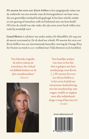 'We moeten het even over Kevin hebben' van Lionel Shriver is het aangrijpende relaas van de zoektocht van een moeder naar de beweegredenen van haar zoon, die een gruwelijke misdaad heeft gepleegd. Is het haar schuld, omdat ze niet genoeg of misschien zelfs wel helemaal niet van hem hield? Of is het de schuld van zijn vader, die zijn zoon nooit heeft willen zien zoals hij werkelijk was?