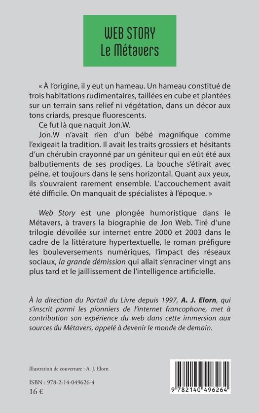 À l'origine, il y eut un hameau. Un hameau constitué de trois habitations rudimentaires, taillées en cube et plantées sur un terrain sans relief ni végétation, dans un décor aux tons criards, presque fluorescents. Ce fut là que naquit Jon.W. Jon.W n'avait rien d'un bébé magnifique comme l'exigeait la tradition. Il avait les traits grossiers et hésitants d'un chérubin crayonné par un géniteur qui en eût été aux balbutiements de ses prodiges. La bouche s'étirait avec peine, et toujours dans le sens horizontal. Quant aux yeux, ils s'ouvraient rarement ensemble. L'accouchement avait été difficile. On manquait de spécialistes à l'époque. Web Story est une plongée humoristique dans le Métavers, à travers la biographie de Jon Web. Tiré d'une trilogie dévoilée sur internet entre 2000 et 2003 dans le cadre de la littérature hypertextuelle, le roman préfigure les bouleversements numériques, l'impact des réseaux sociaux, la grande démission qui allait s'enraciner vingt ans plus tard et le jaillissement de l'intelligence artificielle.