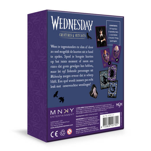 Wees je tegenstanders te slim af door zo snel mogelijk de kaarten uit je hand te spelen. Speel je hoogste kaarten op het juiste moment of neem een risico dat grote gevolgen kan hebben, maar let op! Bekende personages uit Wednesday zorgen ervoor dat je scherp blijft. Een spel wordt immers pas echt leuk met onverwachtse wendingen!