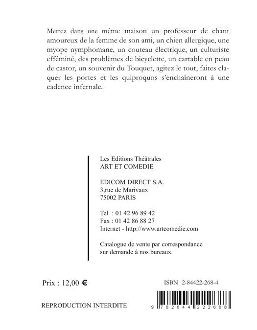 Mettez dans une même maison un professeur de chant amoureux de la femme de son ami, un chien allergique, une myope nymphomane, un couteau électrique, un culturiste efféminé, des problèmes de bicyclette, un cartable en peau de castor, un souvenir du Touquet, agitez le tout, faites claquer les portes et les quiproquos s'enchaîneront à une cadence infernale.