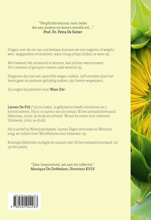 Vragen over de zin van ons bestaan kunnen we niet negeren of wegduwen, wegspoelen of verdoven, want vroeg of laat duiken ze weer op. Wie beweert hét antwoord te kennen, kan je beter wantrouwen. Zo’n mensen of groepen roepen vaak weerzin op. Diegenen die met een open blik wegen zoeken, zelf tevreden door het leven gaan én anderen gelukkig maken, zijn betere wegwijzers. Zij zorgen bij iedereen voor Weer Zin!