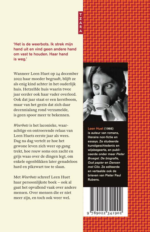 Wanneer Leen Huet op 24 december 2022 haar moeder begraaft, blijft ze als enig kind achter in het ouderlijk huis. Hetzelfde huis waarin twee jaar eerder ook haar vader overleed. Ook dat jaar staat er een kerstboom, maar van het gezin dat zich daar decennialang rond verzamelde, is geen spoor meer te bekennen. Weerbots is het laconieke, waarachtige en ontroerende relaas van Leen Huets eerste jaar als wees. Dag na dag vertelt ze hoe het gewone leven zich weer op gang trekt, hoe rouw soms een zacht en grijs waas over de dingen legt, om enkele ogenblikken later genadeloos hard en pikzwart toe te slaan. Met Weerbots schreef Leen Huet haar persoonlijkste boek – ook al gaat het opvallend vaak over andere mensen. Over mensen die er niet meer zijn, en toch ook weer wel.