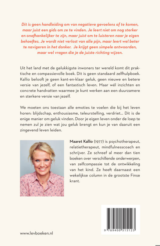 De Scandinavische bestseller over het vinden van je eigen weg naar veerkracht en zelfcompassie Uit het land met de gelukkigste inwoners ter wereld komt dit praktische en compassievolle boek. Het is geen standaard zelfhulpboek. Kallio belooft je geen kant-en-klaar geluk, geen nieuwe en betere versie van jezelf, of een fantastisch leven. Maar wél inzichten en concrete handvatten waarmee je kunt werken aan een duurzamere en sterkere versie van jezelf. We moeten ons toestaan alle emoties te voelen die bij het leven horen: blijdschap, enthousiasme, teleurstelling, verdriet… Dit is de enige manier om geluk te vinden. Door je eigen leven onder de loep te nemen zul je zien wat jou geluk brengt en kun je van daaruit een zingevend leven leiden.