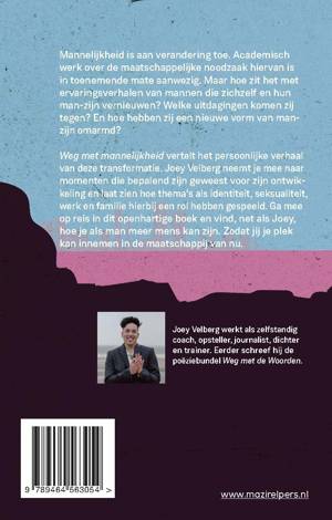 Weg met mannelijkheid vertelt het persoonlijke verhaal van deze transformatie. Joey Velberg neemt je mee naar momenten die bepalend zijn geweest voor zijn ontwikkeling en laat zien hoe thema’s als identiteit, seksualiteit, werk en familie hierbij een rol hebben gespeeld. Ga mee op reis in dit openhartige boek en vind, net als Joey, hoe je als man meer mens kan zijn. Zodat jij je plek kan innemen in de maatschappij van nu.