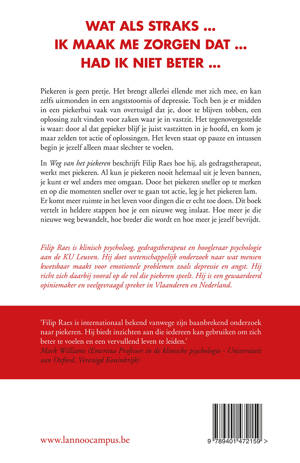 WAT ALS STRAKS ... IK MAAK ME ZORGEN DAT ... HAD IK NIET BETER ... Piekeren is geen pretje. Het brengt allerlei ellende met zich mee, en kan zelfs uitmonden in een angststoornis of depressie. Toch ben je er midden in een piekerbui vaak van overtuigd dat je, door te blijven tobben, een oplossing zult vinden voor zaken waar je in vastzit. Het tegenovergestelde is waar: door al dat gepieker blijf je juist vastzitten in je hoofd, en kom je maar zelden tot actie of oplossingen. Het leven staat op pauze en intussen begin je jezelf alleen maar slechter te voelen. In Weg van het piekeren beschrijft Filip Raes hoe hij, als gedragstherapeut, werkt met piekeren. Al kun je piekeren nooit helemaal uit je leven bannen, je kunt er wel anders mee omgaan. Door het piekeren sneller op te merken en op die momenten sneller over te gaan tot actie, leg je het piekeren lam. Er komt meer ruimte in het leven voor dingen die er echt toe doen. Dit boek vertelt in heldere stappen hoe je een nieuwe weg inslaat. Hoe meer je die nieuwe weg bewandelt, hoe breder die wordt en hoe meer je jezelf bevrijdt.