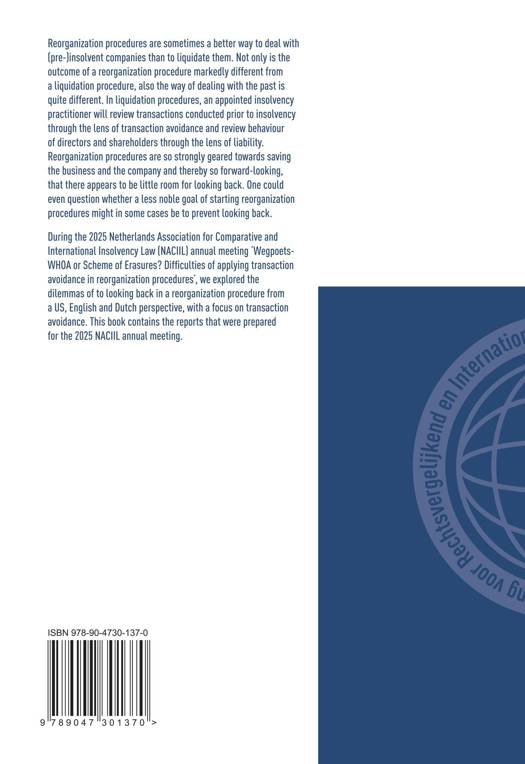 Reorganization procedures are sometimes a better way to deal with (pre-)insolvent companies than to liquidate them. Not only is the outcome of a reorganization procedure markedly different from a liquidation procedure, also the way of dealing with the past is quite different. In liquidation procedures, an appointed insolvency practitioner will review transactions conducted prior to insolvency through the lens of transaction avoidance and review behaviour of directors and shareholders through the lens of liability. Reorganization procedures are so strongly geared towards saving the business and the company and thereby so forward-looking, that there appears to be little room for looking back. One could even question whether a less noble goal of starting reorganization procedures might in some cases be to prevent looking back. During the 2025 Netherlands Association for Comparative and International Insolvency Law (NACIIL) annual meeting ‘WegpoetsWHOA or Scheme of Erasures? Difficulties of applying transaction avoidance in reorganization procedures’, we explored the dilemmas of to looking back in a reorganization procedure from a US, English and Dutch perspective, with a focus on transaction avoidance. This book contains the reports that were prepared for the 2025 NACIIL annual meeting