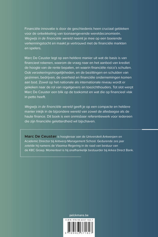 Financiële innovatie is door de geschiedenis heen cruciaal gebleken voor de ontwikkeling van toonaangevende wereldeconomieën. Wegwijs in de financiële wereld neemt je mee op een boeiende verkenningstocht en maakt je vertrouwd met de financiële markten en spelers. Marc De Ceuster legt op een heldere manier uit wat de basis is van financieel rekenen, waarom de vraag naar en het aanbod van krediet de hoogte van de rente bepalen, en waarin financiële risico’s schuilen. Ook verzekeringsmogelijkheden, en de bezittingen en schulden van gezinnen, bedrijven, de overheid en financiële ondernemingen komen aan bod. Zowel op het nationale als internationale niveau wordt er gekeken naar de rol van regelgevers en toezichthouders. Tot slot werpt Marc De Ceuster een blik op de toekomst en wat die op financieel vlak in petto heeft.