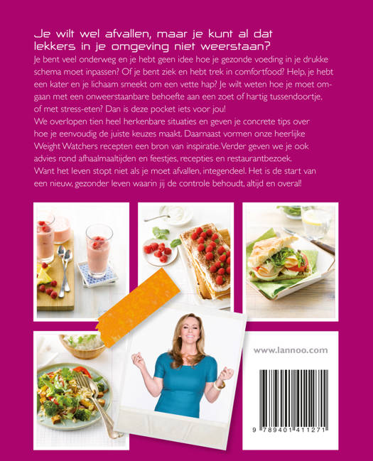 Hoe overleef je de dagelijkse jungle van verleidingen? Praktische survivaltips van Weight Watchers. Je wilt wel afvallen, maar je kunt al dat lekkers in je omgeving niet weerstaan? Je bent veel onderweg of je hebt geen idee hoe je gezonde voeding in je drukke schema moet inpassen? Of je bent ziek en hebt trek in comfortfood? Help, je hebt een kater en je lichaam smeekt om een vette hap? Je wilt weten hoe je moet omgaan met een onweerstaanbare behoefte aan een zoet of hartig tussendoortje, of met stress-eten? Dan is deze pocket iets voor jou! We overlopen tien heel herkenbare situaties en geven je concrete tips over hoe je eenvoudig de juiste keuzes maakt. Daarnaast vormen onze heerlijke Weight Watchers recepten een bron van inspiratie. Verder geven we je ook advies rond afhaalmaaltijden en feestjes, recepties en restaurantbezoek. Want het leven stopt niet als je moet afvallen, integendeel. Het is de start van een nieuw, gezonder leven waarin jij de controle behoudt, altijd en overal!