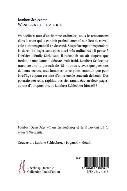 « Et à nouveau nous nous asseyions en silence en songeant que nous n’avions aucune raison d'exister. » Cette citation de l’écrivain hollandais Nescio (dont le nom de plume latin signifie : « Je ne sais pas »), placée en épigraphe de ce livre, en indique la tonalité. Wendelin et les autres réunit seize brèves nouvelles. Ce sont autant de portraits de personnages solitaires, marginaux ou vieillissants, saisis le plus souvent dans un moment creux de leur existence, propice à la songerie et au retour sur soi. Chaque nouvelle, de trois ou quatre pages, est constituée d’une seule phrase, comme pour mieux épouser le flux de conscience de ces personnages. Voici, par exemple, Wendelin. Wendelin a tout d’un homme ordinaire. Nous le rencontrons dans le tram qui le conduit sans doute à son lieu de travail et le quittons quand il en descend. Ses préoccupations pendant la durée du trajet sont elles aussi très ordinaires. Il pense à l’herbier d'Emily Dickinson. Il reconnaît un air d’opéra que fredonne une dame. Il déteste avoir froid. Les illustrations de Lysianne Schlechter – au nombre de seize, elles aussi – mettent toutes en scène le même personnage. Elles suggèrent que ces nouvelles pourraient être autant de fragments d’un autoportrait imaginaire, éclairant chacun une facette de la vie intérieure de l’auteur.
