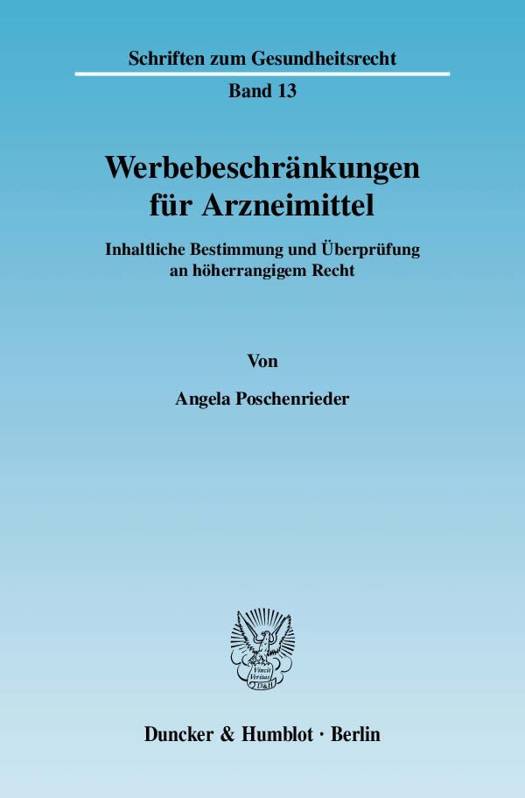 Am Arzneimittelmarkt tangieren die Werbebeschränkungen unterschiedliche, zum Teil einander entgegenstehende Interessen: Die Interessen der Verbraucher, der verschreibenden Ärzte, der beratenden Apotheken, der Krankenkassen und der Arzneimittelindustrie. Angela Poschenrieder überprüft, ob durch die vorhandenen Vorschriften ein angemessener Ausgleich dieser Interessen gelungen ist. Wie der Untertitel verrät, wird eine systematische Einteilung, Erklärung und Bewertung der in Deutschland geltenden Werbebeschränkungen für Arzneimittel sowie eine rechtliche Überprüfung dieser Beschränkungen an höherrangigem nationalem und europäischem Recht vorgenommen. Die dogmatische Aufbereitung des Themas bildet gleichzeitig ein Beispiel für das Ineinandergreifen von nationalem und europäischem Recht anhand eines eng umrissenen Rechtsgebiets.