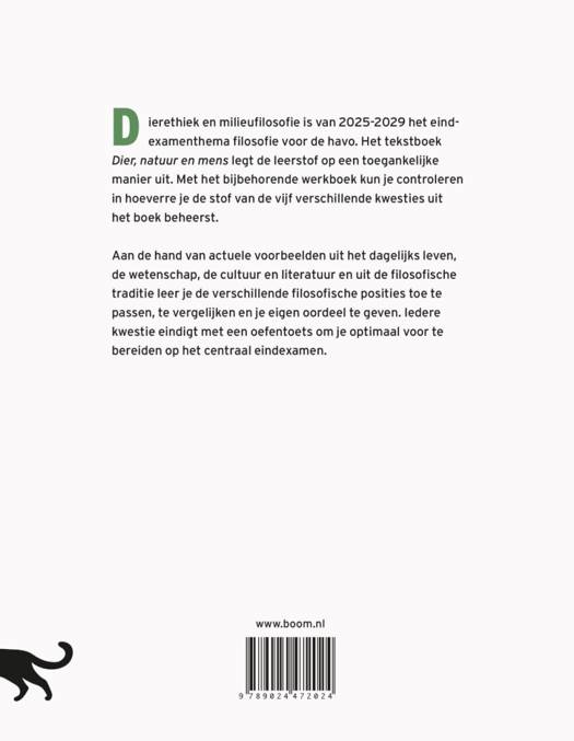 Dierethiek en milieufilosofie is van 2025-2029 het eindexamenthema filosofie voor de havo. Het tekstboek Dier, natuur en mens legt de leerstof op een toegankelijke manier uit. Met het bijbehorende werkboek kun je controleren in hoeverre je de stof van de vijf verschillende kwesties uit het boek beheerst.