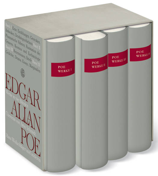 Diese vierbändige Ausgabe mit den Übersetzungen von Arno Schmidt und Hans Wollschläger ist die maßgebliche und bei weitem umfassendste Ausgabe der Schriften von Edgar Allan Poe im deutschen Sprachraum. Zum 200. Geburtstag des großen amerikanischen Autors erscheint sie in besonders edler Ausstattung: in graues Leinen gebunden, auf Dünndruckpapier, mit Fadenheftung und Lesebändchen. Sie versammelt seine berühmten Detektivgeschichten, die phantastischen und rätselhaften Romane ebenso wie die Gedichte Poes, journalistische Arbeiten, Essays sowie eine Auswahl seiner Briefe. Sämtliche Texte wurden für diese Ausgabe neu übertragen und kenntnisreich kommentiert.Edgar Allan Poe war mit seinen unheimlichen Erzählungen, den Nachtstücken, dem Grauen, den Alpträumen, der Flucht ins Jenseits des Grabes immer populär. Doch erst im 20. Jahrhundert wurden seine Visionen in ihrer Einzigartigkeit ernst genommen, wurde sein Rang als Sprachkünstler und bedeutsamer Vorläufer der modernen Literatur erkannt. Der Fall des Hauses Ascher, Die Morde in der Rue Morgue, Der Goldkäfer, Bericht des Arthur Gordon Pym von Nantucket, Das Tagebuch des Julius Rodman, Grube und Pendel, das berühmte Gedicht Der Rabe faszinieren Kritik und großes Publikum gleichermaßen. Mit seinen journalistischen Arbeiten, in erster Linie Besprechungen, verdiente Poe lange seinen Lebensunterhalt; seine poetologischen Aufsätze sind Schlüsselwerke für das Selbstverständnis moderner Dichtung.Schon immer wurde Poe von bedeutenden Schriftstellern übersetzt: In den Übertragungen von Charles Baudelaire und Stéphane Mallarmé ist er in Europa berühmt geworden, noch bevor seine Bedeutung in seiner Heimat anerkannt war. Die Werkausgabe mit den Übertragungen von Arno Schmidt und Hans Wollschläger hat in Deutschland Maßstäbe gesetzt.Inhalt:Band I: Erste Erzählungen; Grotesken; Arabesken; DetektivgeschichtenBand II: Phantastische Fahrten; Faszination des Grauens; Kosmos und EschatologieBand III: Rezensionen, Briefe