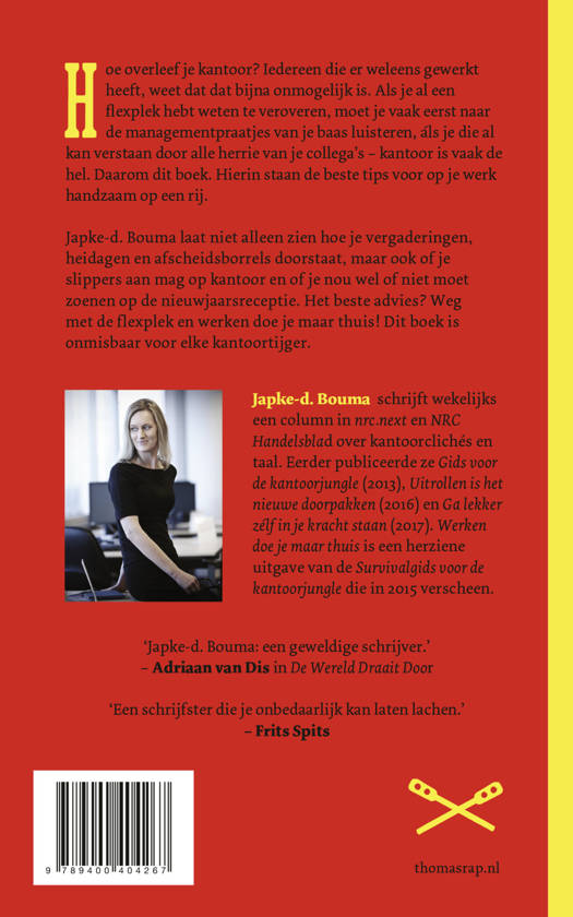 Japke-d. Bouma laat niet alleen zien hoe je vergaderingen, heidagen en afscheidsborrels doorstaat, maar ook of je slippers aan mag op kantoor en of je nou wel of niet moet zoenen op de nieuwjaarsreceptie. Het beste advies? Weg met de flexplek en werken doe je maar thuis! Dit boek is onmisbaar voor elke kantoortijger.