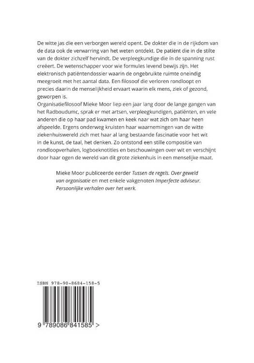 De witte jas die een verborgen wereld opent. De dokter die in de rijkdom van de data ook de verwarring van het weten ontdekt. De patiënt die in de stilte van de dokter zichzelf hervindt. De verpleegkundige die ín de spanning rust creëert. De wetenschapper voor wie formules levend bewijs zijn. Het elektronisch patiëntendossier waarin de ongebruikte ruimte oneindig meegroeit met het aantal data. Een filosoof die verloren rondloopt en precies daarin de menselijkheid ervaart waarin elk mens, ziek of gezond, geworpen is. Organisatiefilosoof Mieke Moor liep een jaar lang door de lange gangen van het Radboudumc, sprak er met artsen, verpleegkundigen, patiënten, en vele anderen die op haar pad kwamen en keek naar wat zich om haar heen afspeelde. Ergens onderweg kruisten haar waarnemingen van de witte ziekenhuiswereld zich met haar al lang bestaande fascinatie voor het wit in de kunst, de taal, het denken. Zo ontstond een stille compositie van rondloopverhalen, logboeknotities en beschouwingen over wit en verschijnt door haar ogen de wereld van dit grote ziekenhuis in een menselijke maat.