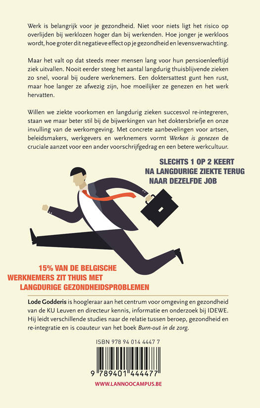 SLECHTS 1 OP 2 KEERT NA LANGDURIGE ZIEKTE TERUG NAAR DEZELFDE JOB 15% VAN DE BELGISCHE WERKNEMERS ZIT THUIS MET LANGDURIGE GEZONDHEIDSPROBLEMEN Werk is belangrijk voor je gezondheid. Niet voor niets ligt het risico op overlijden bij werklozen hoger dan bij werkenden. Hoe jonger je werkloos wordt, hoe groter dit negatieve effect op je gezondheid en levensverwachting. Maar het valt op dat steeds meer mensen lang voor hun pensioenleeftijd ziek uitvallen. Nooit eerder steeg het aantal langdurig thuisblijvende zieken zo snel, vooral bij oudere werknemers. Een doktersattest gunt hen rust, maar hoe langer ze afwezig zijn, hoe moeilijker ze genezen en het werk hervatten. Willen we ziekte voorkomen en langdurig zieken succesvol re-integreren, staan we maar beter stil bij de bijwerkingen van het doktersbriefje en onze invulling van de werkomgeving. Met concrete aanbevelingen voor artsen, beleidsmakers, werkgevers en werknemers vormt Werken is genezen de cruciale aanzet voor een ander voorschrijfgedrag en een betere werkcultuur.