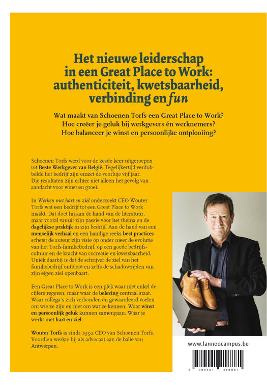Het nieuwe leiderschap in een Great Place to Work: authenticiteit, kwetsbaarheid, verbinding en fun Wat maakt van Schoenen Torfs een Great Place to Work? Hoe creëer je geluk bij werkgevers én werknemers? Hoe balanceer je winst en persoonlijke ontplooiing? Schoenen Torfs werd voor de vijfde keer uitgeroepen tot Beste Werkgever van België. Tegelijkertijd verdubbelde het bedrijf zijn omzet de voorbije vijf jaar. Die resultaten zijn echter niet alleen het gevolg van aandacht voor winst en groei. In Werken met hart en ziel onderzoekt CEO Wouter Torfs wat een bedrijf tot een Great Place to Work maakt. Dat doet hij aan de hand van de literatuur, maar vooral vanuit zijn passie voor het thema en de dagelijkse praktijk in zijn bedrijf. Aan de hand van een menselijk verhaal en een handige reeks best practices schetst de auteur zijn visie op onder meer de evolutie van het Torfs-familiebedrijf, op een goede bedrijfscultuur en de kracht van cocreatie en kwetsbaarheid. Uniek daarbij is dat de schrijver de ziel van het familiebedrijf ontbloot en zelfs de schaduwzijden van zijn eigen ziel openbaart. Een Great Place to Work is een plek waar niet enkel de cijfers regeren, maar waar de beleving centraal staat. Waar collega's zich verbonden en gewaardeerd voelen om wie ze zijn en niet om wat ze kennen. Waar winst en persoonlijk geluk kunnen samengaan. Waar je werkt met hart en ziel.