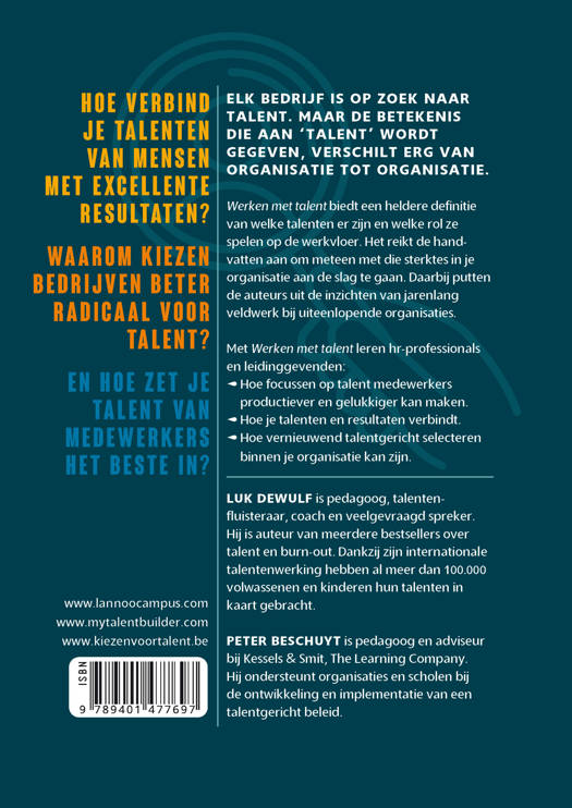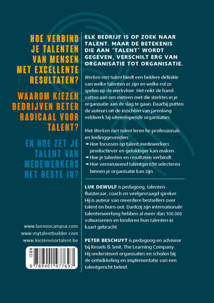 Hoe verbind je talenten van mensen met excellente resultaten? Waarom kiezen bedrijven beter radicaal voor talent? En hoe zet je talent van medewerkers het beste in? Elk bedrijf is op zoek naar talent. Maar de betekenis die aan 'talent' wordt gegeven, verschilt erg van organisatie tot organisatie. Werken met talent biedt een heldere definitie van welke talenten er zijn en welke rol ze spelen op de werkvloer. Het reikt de handvatten aan om meteen met die sterktes in je organisatie aan de slag te gaan. Daarbij putten de auteurs uit de inzichten van jarenlang veldwerk bij uiteenlopende organisaties. Met Werken met talent leren hr-professionals en leidinggevenden: